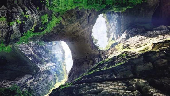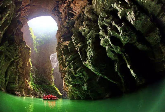 在暗河三橋中間有兩個(gè)橢圓形的漏斗,高度均在100米左右。其中三橋和二橋之間的“天眼”寬度為41米,二橋和一橋之間的“天眼”寬度為52米,而天生二橋的橋梁寬度約25米,這樣的一個(gè)黃金比例使得我們船行至此抬頭仰望,二橋的橋梁仿如仙子的鼻梁,一對(duì)漏斗分立兩邊,仿如一雙“天眼”頓開讓人驚艷。這里便是蒲花暗河最核心的景觀“蒼天有眼”。廩君的族人相信,“人在做天在看”,他們保持著對(duì)自然和天道的最高敬畏,今天的濯水人也時(shí)刻敬畏天理,講究良心。這里的“蒼天有眼”渾然天成,與濯水古鎮(zhèn)上的“天理良心”道德碑遙相呼應(yīng),共同構(gòu)筑了濯水景區(qū)“上蒼有天眼,人間有良心”的活的靈魂。