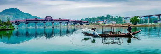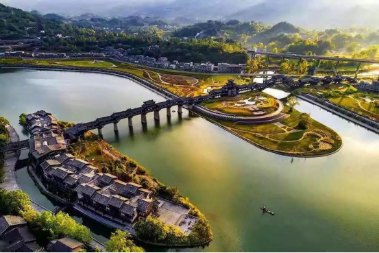 “濯河懷遠(yuǎn)”、“唐鐘長韻””、“彩虹伏波”、“蒲花飛龍”——穿越全長658米的濯水風(fēng)雨廊橋,四段橋身各有特色,線條舒暢、古樸典雅, 在形態(tài)上、結(jié)構(gòu)上、工藝上都實現(xiàn)了傳統(tǒng)與現(xiàn)代的結(jié)合,給人以精彩絕倫的觀感。