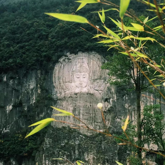 在峽谷頂端回音坪的對面崖壁上,雕刻著一尊目前全世界最高的觀音雕像。觀音像高123米,寬69米。采用深雕、淺雕、浮雕等多種雕刻手段,線條清楚,層次分明。站在回音坪的中間,面向?qū)γ娴挠^音菩薩摩崖造像大聲說話,馬上就會聽到回音,因此稱為觀音回響,不少游客來到這里許下愿望。