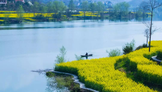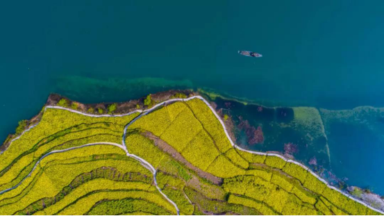 金黃色的油菜花與民居、梯田、道路、池塘相映成趣