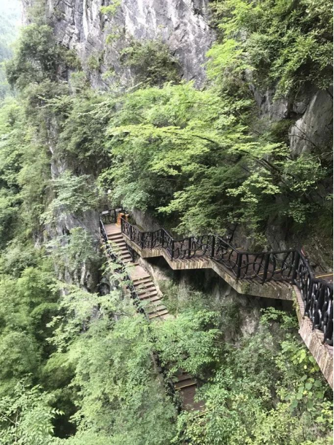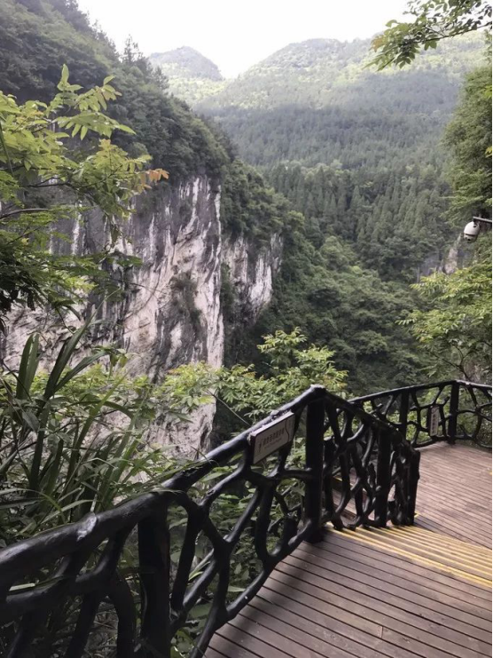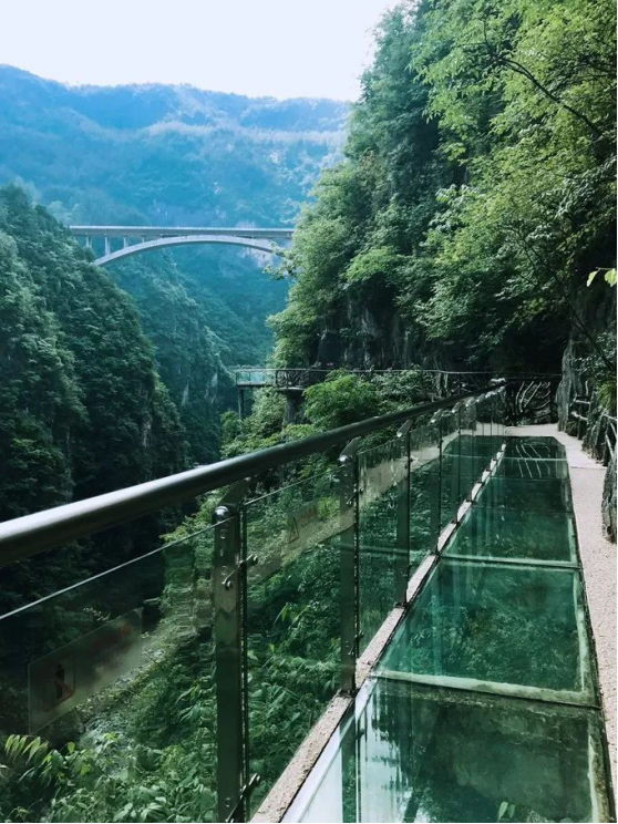 峽谷峭壁直立,崖壁大多與地平線成直角。當你走上808米長的空中棧道,尤其是懸掛在500米高空的透明玻璃棧道,大有“我要飛”的刺激感;