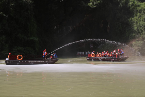 13日上午,參與演練的工作人員在蒲花暗河碼頭前列隊(duì)集合,演練由指揮組、應(yīng)急救援組、醫(yī)療救護(hù)組、后勤保障組、通訊聯(lián)絡(luò)組等組成。本次水上應(yīng)急演練,主要以溺水事故、游船起火事故為案例,對(duì)現(xiàn)場(chǎng)警戒、搶險(xiǎn)救援、傷員救治等工作進(jìn)行實(shí)戰(zhàn)演練,演練全程嚴(yán)肅認(rèn)真,過(guò)程緊張有序,達(dá)到演練預(yù)期效果,取得了圓滿成功。