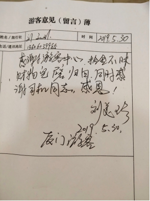 15:15分左右,陳先生一行三人來(lái)到了游客接待中心,在核實(shí)身份、錢(qián)包后,龔節(jié)倫將錢(qián)包歸還給了陳先生,陳先生和她的朋友再三向龔節(jié)倫表示感謝!她說(shuō)道:“濯水景區(qū)不僅風(fēng)景美,景區(qū)工作人員更美!”時(shí)候特地留下感謝信感謝工作人員龔節(jié)倫。