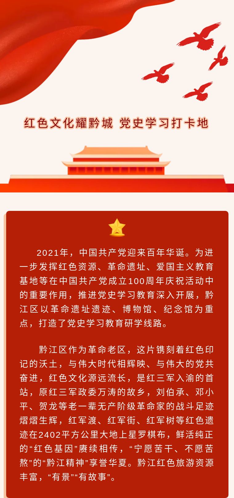 黔江系全國一類革命老區(qū),是湘鄂川(渝)黔革命根據(jù)地的重要組成部分,是中國工農(nóng)紅軍第三軍政委萬濤烈士的故鄉(xiāng)。在黔江這片紅色土地上,曾經(jīng)為之戰(zhàn)斗過的紅軍將士中,在新中國成立后,有62人分別獲得了中華人民共和國授予的中國人民解放軍元帥和將軍軍銜;宋盤銘、周念民、龔昌榮、黃丁山等118位烈士獻(xiàn)出了寶貴的生命。