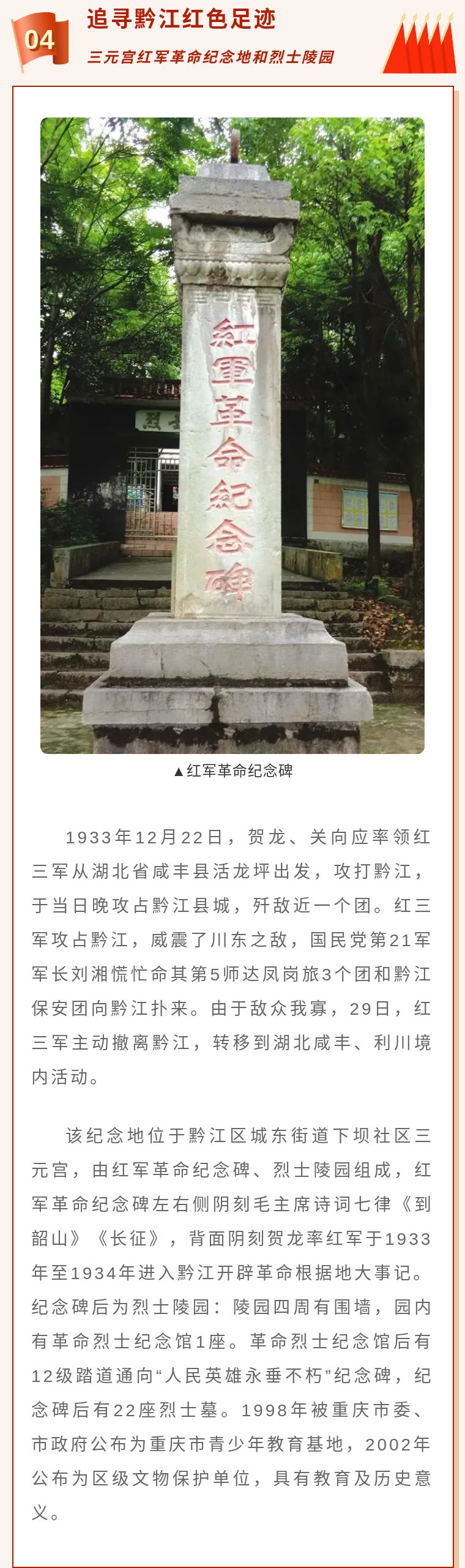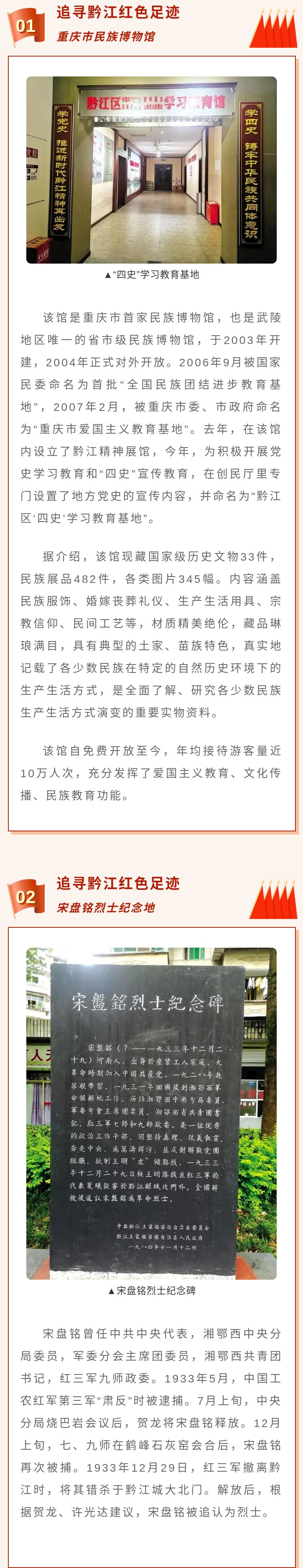 第一條線路:重慶市民族博物館(城西街道新華大道西段512號(hào))、宋盤銘烈士紀(jì)念地(城西街道河濱公園商務(wù)委后門處)、紅軍廣場(城東街道石城社區(qū)小廣場)、三元宮紅軍革命紀(jì)念地和烈士陵園(城東街道下壩社區(qū)三元宮路609號(hào))。