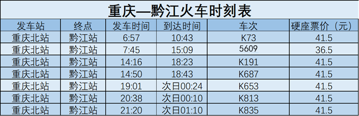 目前全國有多條鐵路線路經(jīng)過黔江火車站經(jīng)停,火車站外包車或出租車前往景區(qū),費用約100元/車,以下是火車班次(僅供參考,火車班次依實際售票為準(zhǔn)):